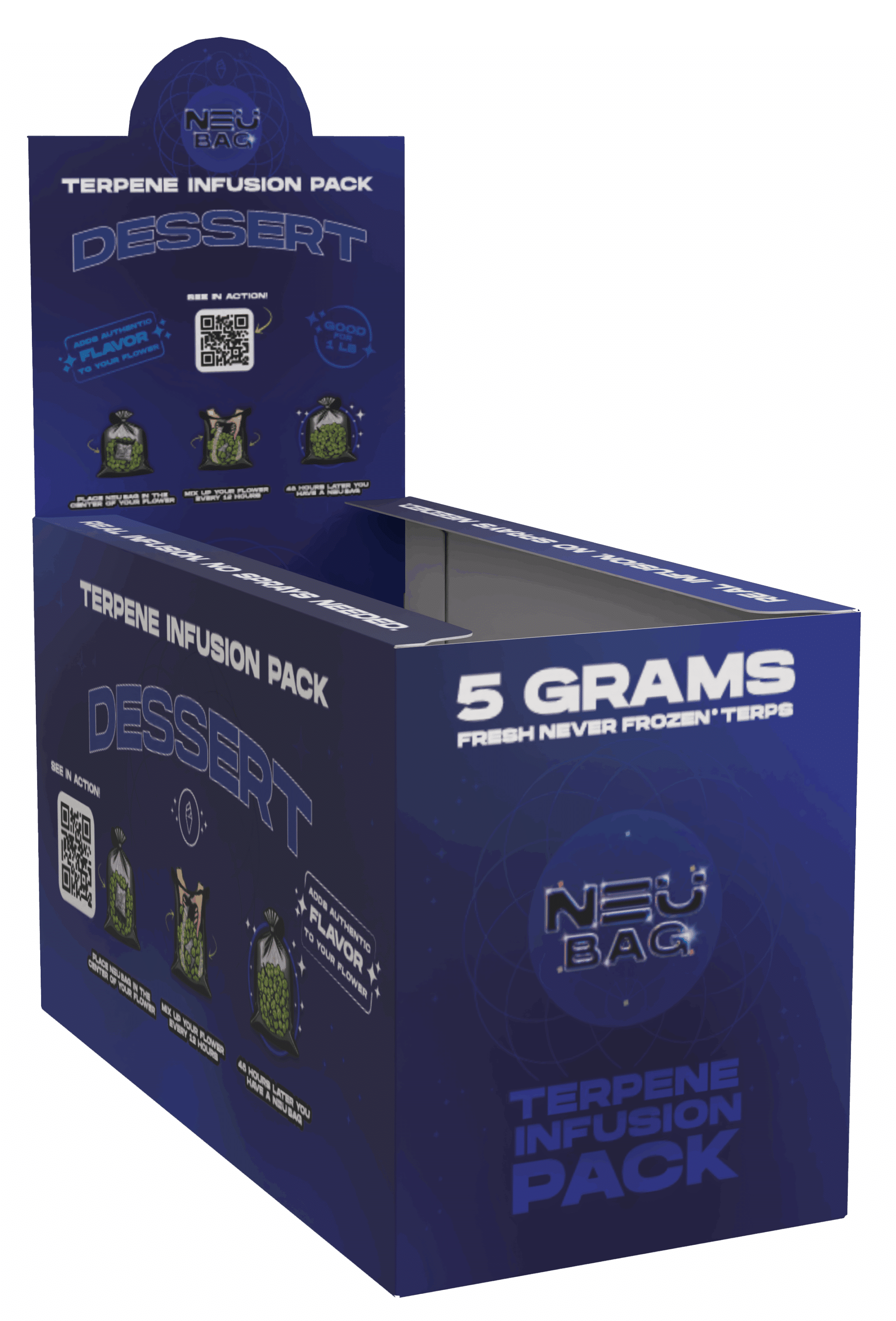 The Dessert NEU Bags are mesh infusion packs saturated with Fresh Never Frozen terpenes. Once an NEU has been placed into a bag or bin with cured material, the diffusion process gently migrates the oil from the infusion pack to the cured material. Over the course of the first 48 hours, all of the terpenes will have left the infusion pack and become saturated in the cured material. And that’s how you get an NEU Bag. The Dessert flavors and aromas are similar to the Wedding Cake, Sherbert, and Lemon Cherry Gelato strains.