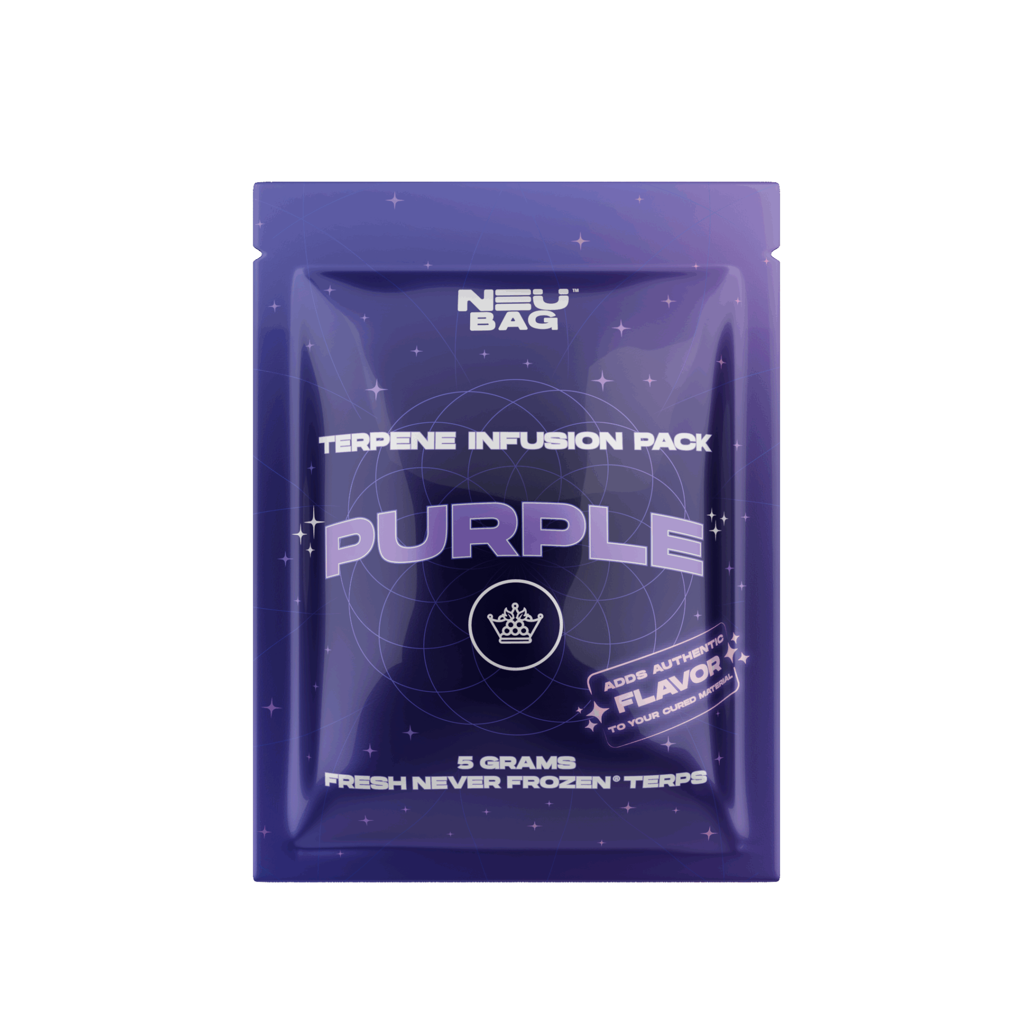 The Purple NEU Bags are mesh infusion packs saturated with Fresh Never Frozen terpenes. Once an NEU has been placed into a bag or bin with cured material, the diffusion process gently migrates the oil from the infusion pack to the cured material. Over the course of the first 48 hours, all of the terpenes will have left the infusion pack and become saturated in the cured material. And that’s how you get an NEU Bag. The Purple flavors and aromas are similar to the Granddaddy Purple and Purple Urkle strains.