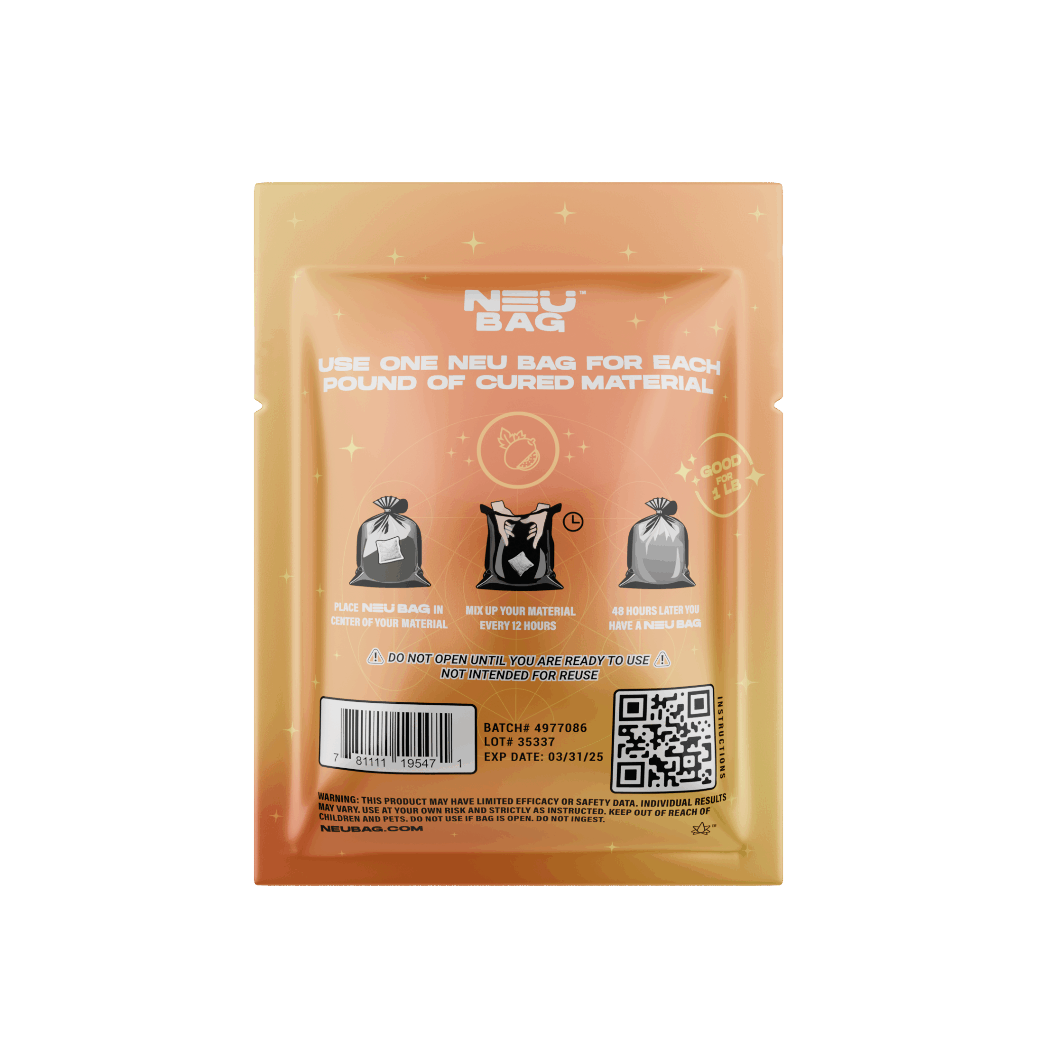 - How to Use. Remove the infusion pack from the mylar bag, place the pack in the middle of the cured material, seal the bag or bin, wait 12 hours and mix, continue mixing and re-centering the bag for at least 48 hours, remove the infusion pack, and you have a NEU Bag. Do not cut open the mesh bag. Do not use the pack if it is leaking solid media. Oil may leak out of the pack before use, this is normal. Use gloves when handling infusion packs.