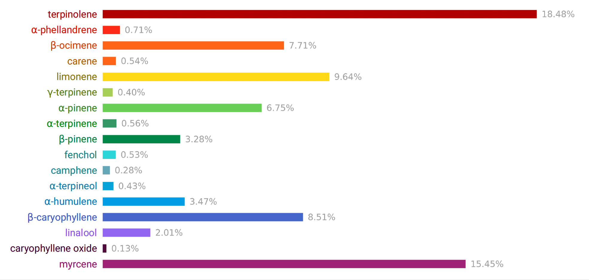 - Terpinolene (18.48%): Known for its multifaceted aroma that combines floral, citrus, and herbal notes.