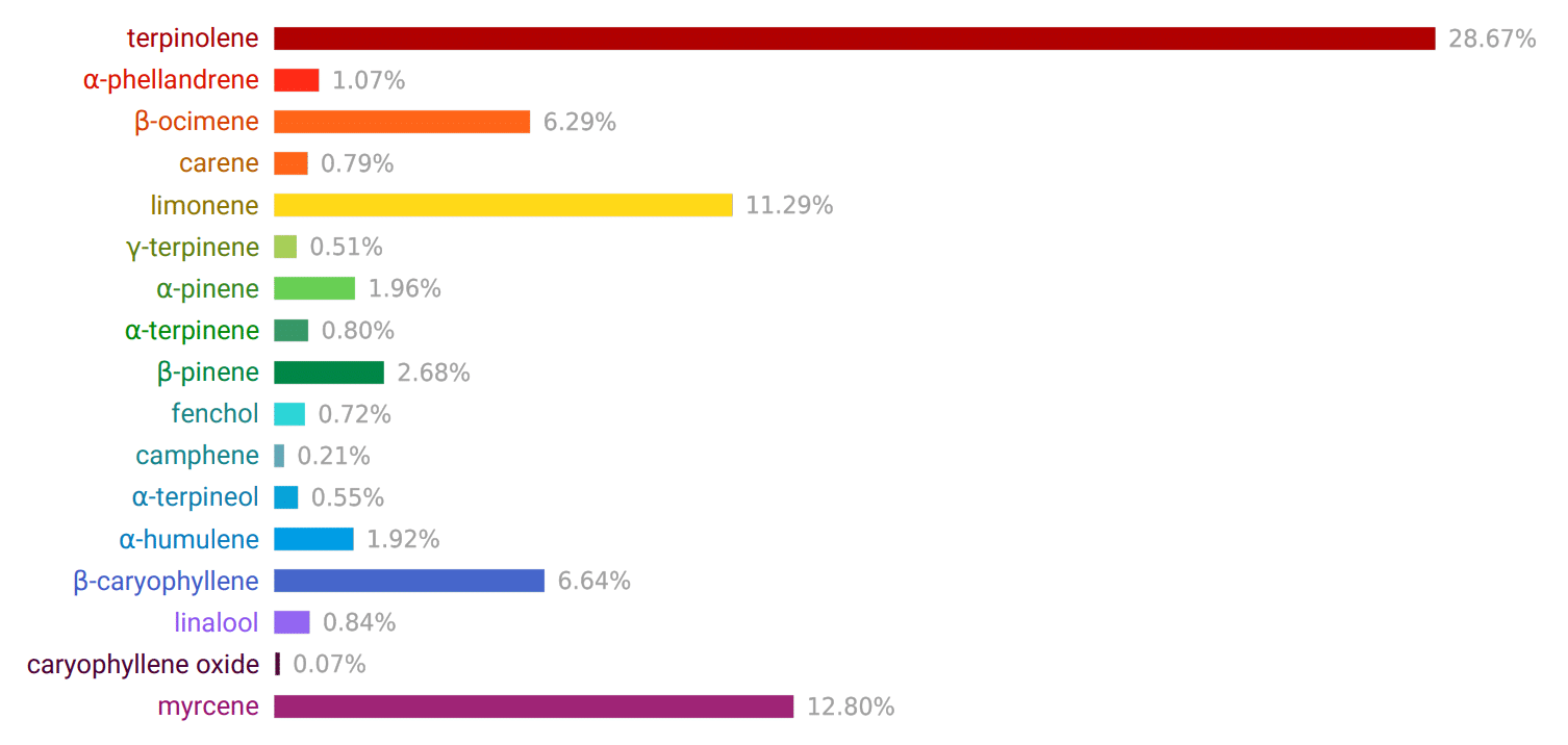 • Terpinolene (28.67%): Provides a fresh, piney, and slightly citrus-forward aroma with uplifting effects.