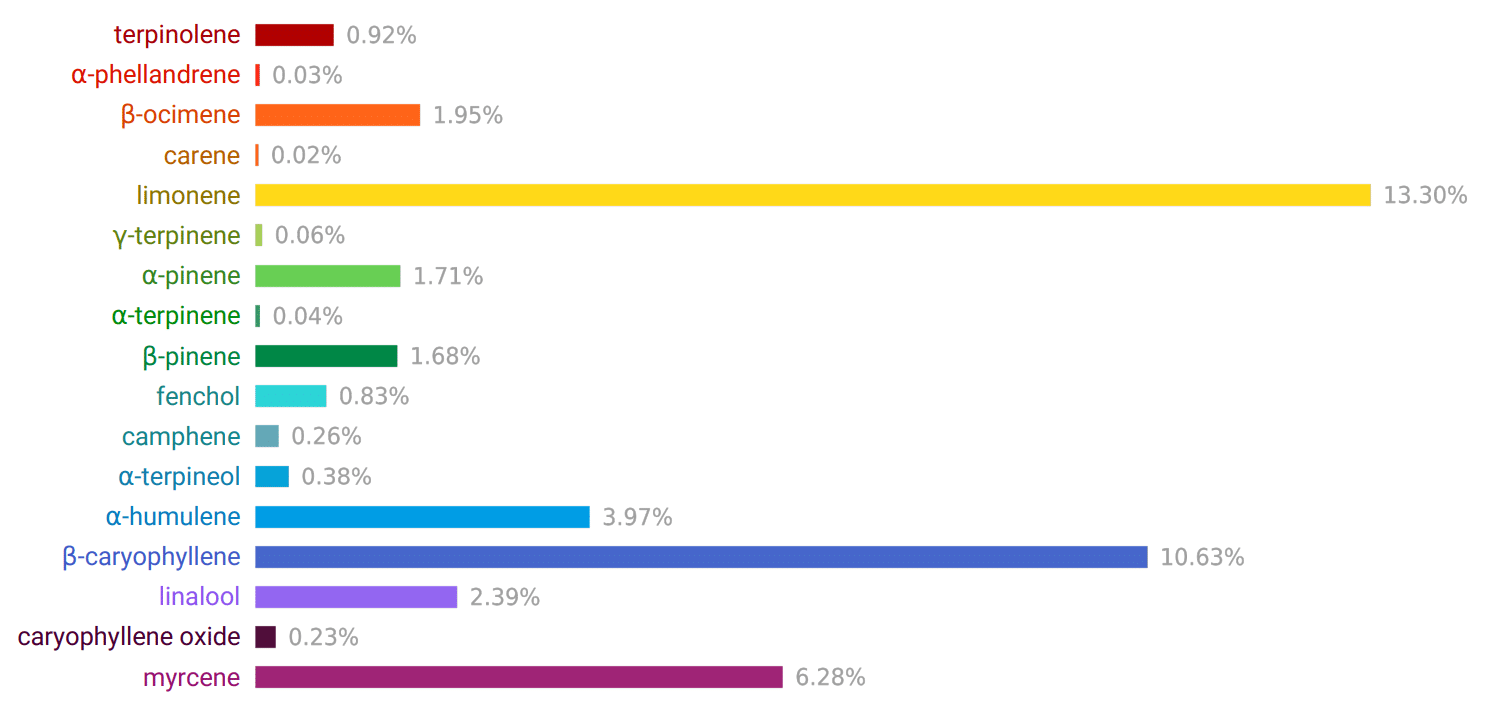 - α-Humulene (5.90%): Imparts an earthy, woody aroma, known for its anti-inflammatory and appetite-suppressing properties.