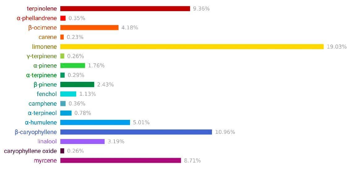 - Terpinolene (9.36%): Known for its multifaceted aroma that combines floral, citrus, and herbal notes.