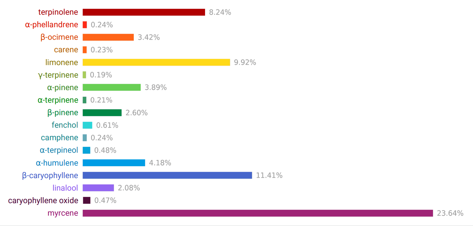- Myrcene (23.64%): Adds musky, earthy undertones, often associated with calming and relaxing effects.